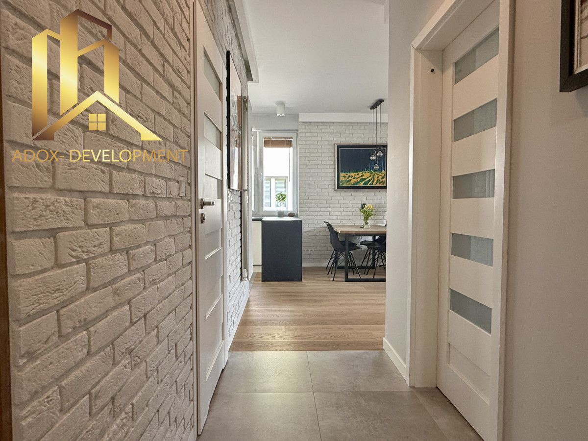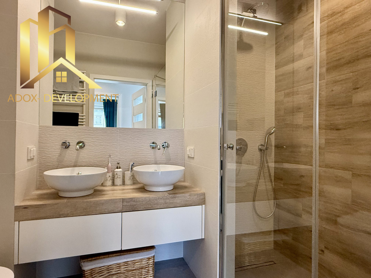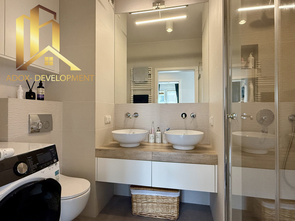 Łazienka o powierzchni 4,57 m² została wyposażona w dwie umywalki, co zwiększa komfort codziennego użytkowania. W przedpokoju znajduje się duża szafa w zabudowie, zapewniająca dużo miejsca do przechowywania.